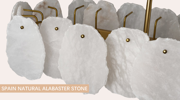 This image highlights the refined beauty of Spain-sourced natural alabaster, renowned for its soft translucence and cloud-like veining. Each stone panel displays unique patterns formed over thousands of years, allowing light to pass through with a warm, diffused glow. The material’s natural variations make every fixture one-of-a-kind, adding depth, elegance, and artisanal character to the design.