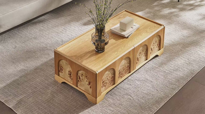 Dieser Couchtisch aus hochwertigen Mehrschichtplatten mit natürlichem Eichen- und Birkenmaserfurnier zelebriert die Schönheit authentischen Holzes. Die offenporige Naturoberfläche bewahrt die einzigartige Maserung und Textur jeder Platte und verleiht jedem Stück ein einzigartiges Aussehen und eine warme, haptische Haptik. Diese Konstruktion erhöht nicht nur die Haltbarkeit, sondern sorgt auch für dauerhafte Stabilität und Verzugsfestigkeit.