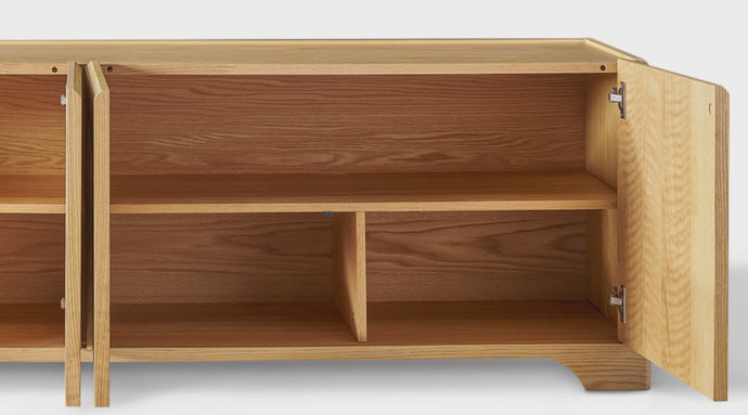 The warm tones of the oak bring a cozy ambiance to the living room, striking the perfect balance between elegance and comfort. It blends seamlessly into my space, sitting perfectly under the TV. Not only does it enhance the room’s sense of depth, but it’s also become a conversation starter whenever friends visit. The wood grain is unique, with a smooth and inviting texture.