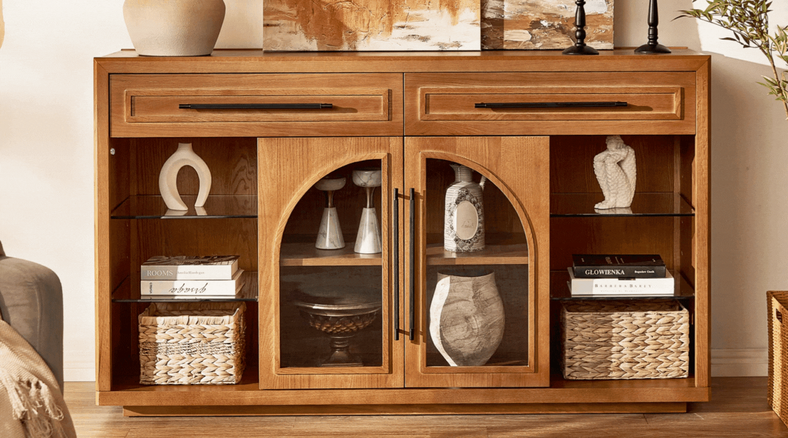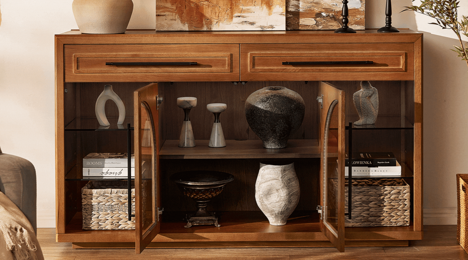 - Gewölbte Türen aus gehärtetem Glas mit verstellbaren Regalen zur einfachen Aufbewahrung größerer Gegenstände.