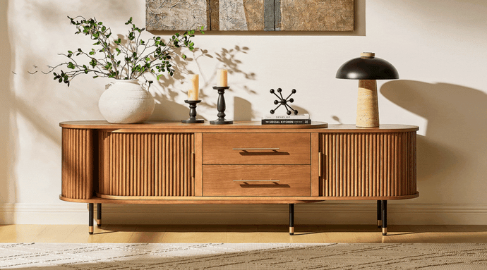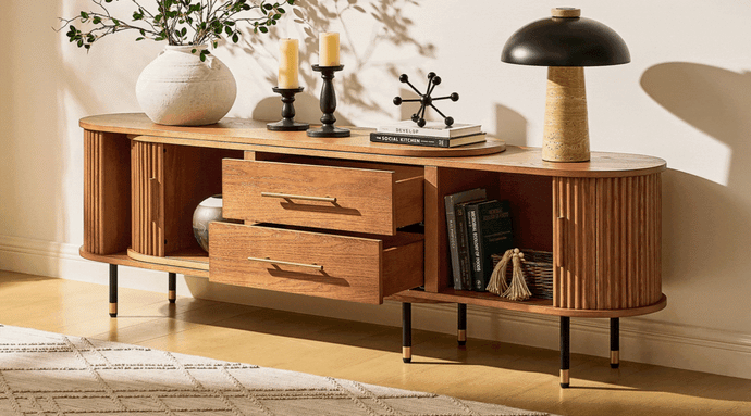 Sturdy construction with a smooth and high-quality extendable mechanism. The piece looks even more attractive in person. We have a small child, and the entire media console has no sharp corners, making it very safe. The drawers feature soft-close functionality, and the sliding doors glide effortlessly.