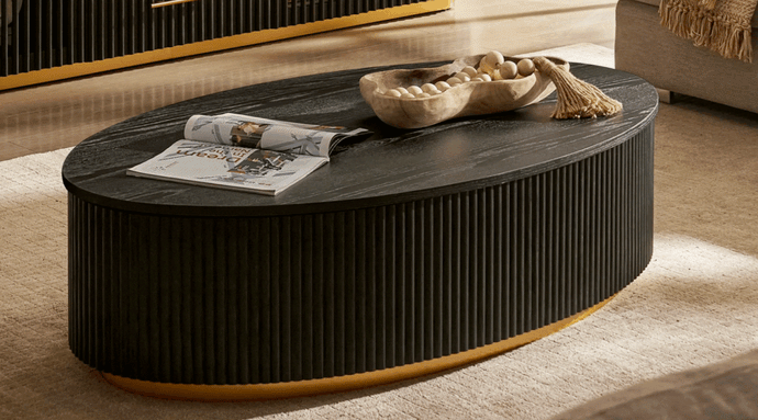 - Oval design with vertical slatted panels, paired with brass-finished legs