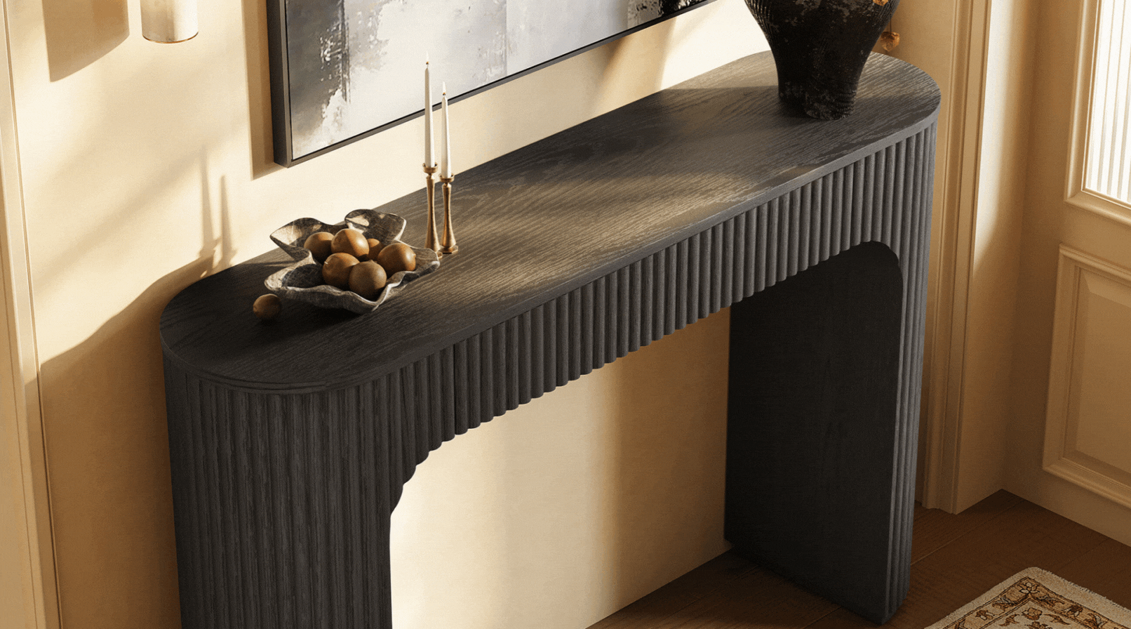 The overall design of this console is incredible; the black finish combined with the natural wood texture looks stunning and very organic. I was pleasantly surprised to find that the drawer features a smooth soft-close mechanism, and the overall workmanship is truly top-tier.