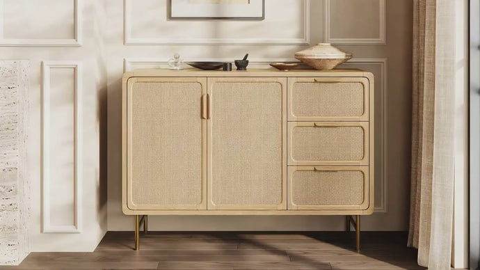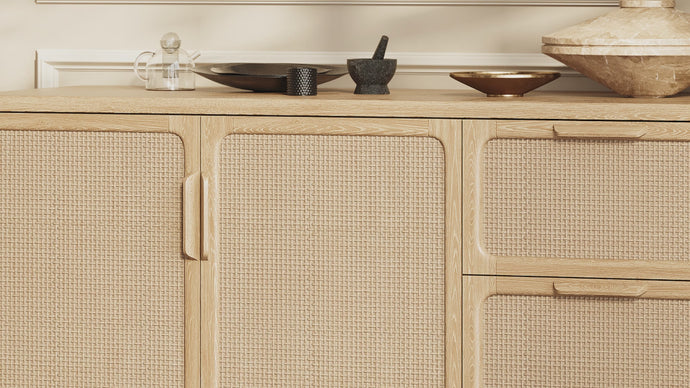 Inspired by the breezy elegance of a coastal retreat, this sideboard is more than just storage—it is an invitation to slow living. The design begins with texture: natural rattan webbing that adds an airy, organic rhythm to the room, capturing the warmth of the sun even on cloudy days.