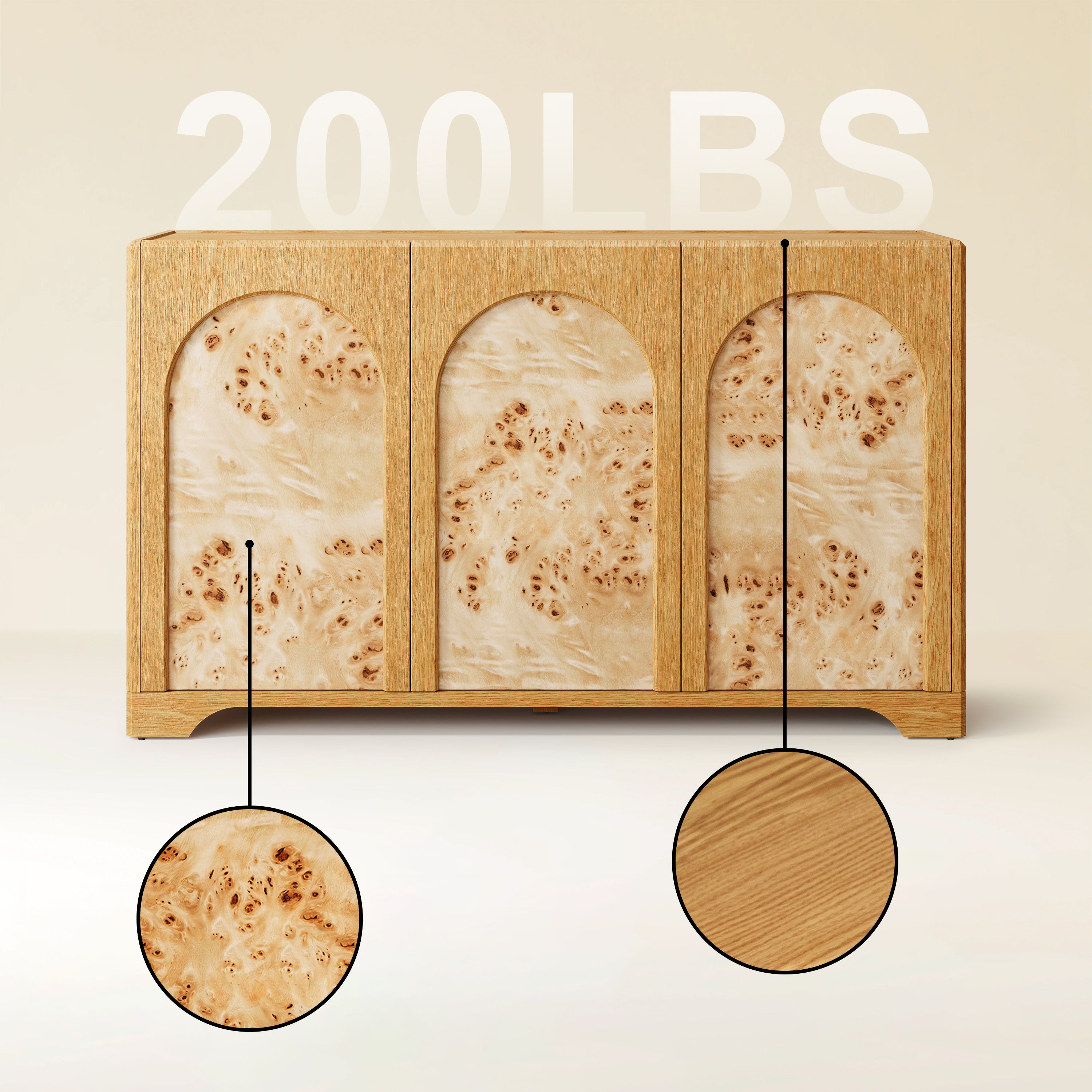 - Boasts natural burl wood characteristics that ensure every individual sideboard is a one-of-a-kind masterpiece.