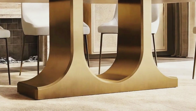 An architectural inverted U-shaped pedestal base in brushed brass provides rock-solid stability while creating a striking visual centerpiece.