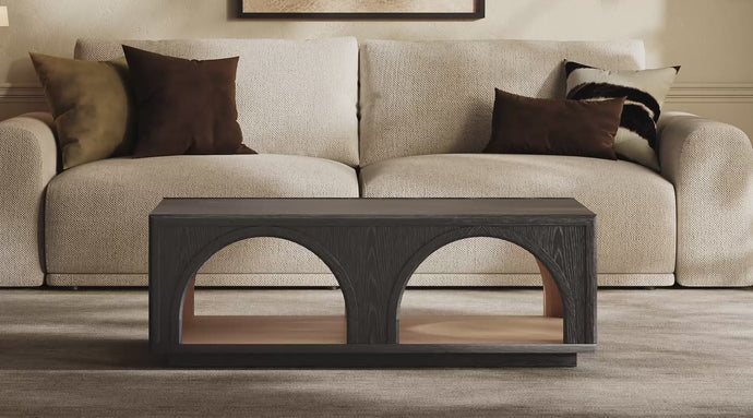 I really love the design of this coffee table! The archways on the side definitely add character and keep the dark table from looking too heavy, giving it a stylish feel. The oak veneer texture is warm and matches perfectly with my light gray sofa (as shown in the picture). The open design is very convenient; I can store books and blankets underneath. It's both practical and elevates the living room's style.